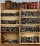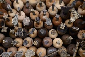 FERS À DORER. Collection d'environ 1428 lettres et fleurons à tige et de 34 roulettes. [Première moitié du XXe siècle]. Fers et roulettes en cuivre sur manches en bois, gravés par Lanty, Guillemain, Bearel, Jarrier, Morand, Chesle, Rougier et...