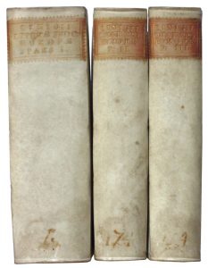 3 volumes in-8, reliure vélin blanc rigide, titre doré au dos sur fond rouge (passé) simulant des pièces de titre, tranches rouges.