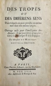 MARSAIS (Monsieur du). Des Tropes ou des Diférens (sic) Sens dans lesquels on peut prendre un même mot dans une même langue. Nouvelle édition. Paris, David, 1767. In-8, reliure de l’époque veau marbrée, dos lisse orné. Légers...