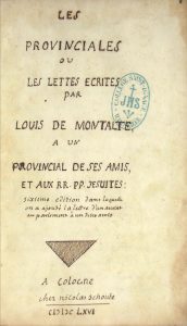 [PASCAL (Blaise)]. Les Provinciales ou Les Lettres Ecrites par Louis de Montalte à un Provincial de ses amis… Sixième Édition dans laquelle on a ajouté la lettre d’un avocat au Parlement… Cologne, Nicolas Schoute, 1666. 2 volumes in-8,...