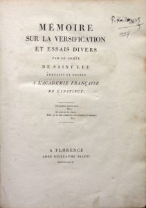 BONAPARTE (Louis Comte de Saint Leu). Mémoire sur la Versification et Essais divers par le Comte de Saint Leu adressés et dédiés à l’Académie française de l’Institut … Florence, G. Piatti, 1819. In-4, reliure de l’époque veau brun à...