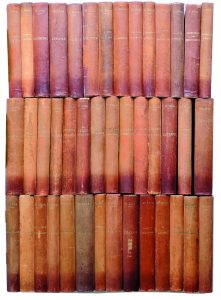 ZOLA (Émile). Œuvres Complètes. Les Rougon-Macquart. Paris, Bibliothèque Charpentier, 1895. 42 volumes in-12, reliure éditeur cuir souple bordeaux, tête dorée, titre doré au dos. Plusieurs dos en partie insolés, mors fendu sur un vol., mors...