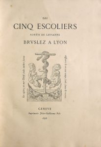 [CRESPIN (Jean)]. Des Cinq Escoliers sortis de Lausanne bruslez a Lyon. Genève, Imprimerie Jules-Guillaume Fick, 1878. In-4, broché. Couverture défraîchie (qq. taches et déchirures marginales). Titre, 213-(2) pp. Qq. rousseurs. Bandeaux,...