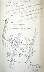 ROUX (Antoine de). Journal Dessiné d’un Prisonnier de Guerre. 1940-1941. Paris, Robert Laffont, 1942. In-4, reliure demi-vélin, titre mansucrit au dos, fils barbelés peints sur les mors. Couverture illustrée conservée. 175-(2) pp. Témoins...