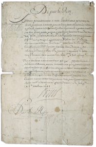 PASSEPORT du ROY pour la conduite de chevaux d’une Compagnie (?). 5 octobre 1688. Grand document manuscrit (38 x 24,5 cm) sur feuillet double. Taches, déchirures aux pliures et en marges. Document signé Louis (secrétaire), contresigné par...