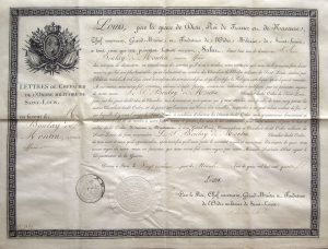 LOUIS XVIII (1755-1824). Lettres de Chevalier de l’Ordre Militaire de Saint-Louis. Paris, 29 novembre 1815. Certificat (31,5 x 41,5 cm) imprimé et complété, sur parchemin, délivré à Jean Boulay de Montru. Cachet sec. Signature tampon Louis,...