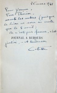 Bel envoi de Colette “aux petites fermières” daté 26 mars 1941. “Pour Yvonne, Pour Thérèse, avant les autres (puisque le livre ne sera en vente que le 5 avril).