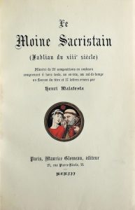 [MALATESTA, ill.]. Le Moine Sacristain (Fabliau du xiiie siècle). Illustré de 26 compositions en couleurs comprenant 6 hors texte, un en-tête, un cul-de-lampe, un fleuron du titre et 17 lettres ornées par Henri Malatesta. Paris, Maurice Glomeau,...