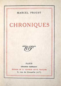 PROUST (Marcel). Chroniques. Paris, NRF, 1927. In-8, reliure demi-chagrin brun, dos (un peu passé) à 5 nerfs, tête dorée. Couvertures et dos conservés. 242-(1) pp. Bon exemplaire. Édition originale tirée à 1374 exemplaires sur Vélin...