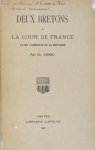 *** EBBO (Ch. d'). Deux Bretons à la cour de France avant l'annexion de la Bretagne. Vannes, Lafolye, 1893, 31 p., [4] planches [Relié à la suite] : DU BREIL DE PONBRIAND (Paul). Un homme d'État breton au XVe siècle, Olivier du Breil. Rennes,...