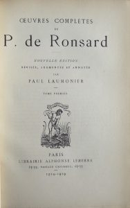 RONSARD (Pierre de). Œuvres Complètes. révisée, augmentée et annotée par Paul Laumonier. Paris, Lemerre, 1914-1919. 8 volumes in-8, reliure demi-basane marbrée, dos à 3 faux-nerfs orné, tête dorée. Qq. légers frottements. Couvertures...