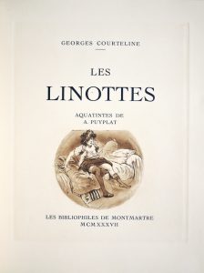 [Puyplat]. COURTELINE (Georges). Les Linottes. Aquatintes de A. Puyplat. Paris, Les Bibliophiles de Montmartre, 1937. In-4, en ff., chemise et étui de l’éditeur. (4)-167-(3) pp. Illustrations tirées en bistre dans le texte. Ouvrage tiré à...