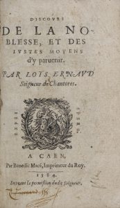 *** [Livres du XVIe s.]. ERNAUD (Loys). Discours de la noblesse, et des iustes moyens d'y parvenir. Par Loys Ernaud, seigneur de Chantores. A Caen, par Benedic Macé, 1584, petit in-8 (15x9,5 cm), [14]-47[7] f., vignette gravée sur bois au titre,...