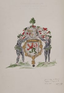 v°, très lisible, illustré de blasons peints en couleurs, reliure époque parchemin, dos à 5 nerfs et muet, lacets (qq. taches aux plats, 1 lacet coupé, bien relié, gardes défraîchies mais intérieur très frais). 1ère partie : Généalogie de la très illustre maison d'Espinay avec les faicts des hommes illustres qui en sont issus… par Richard Beaujouan… Duretal, d'après l'original écrit en 1601-1602, env. 70 f. soit 140 pages, copie fidèle à l'exemplaire conservé par le comte de Boishue ; ce texte avait été publié par Du Paz dans son Histoire généalogique de plusieurs maisons de Bretagne, mais avec qq. changements, le Cte de Palys restitue ici le texte d'origine. - 2e partie : Extrait des registres de la Chambre de la Refformation de la noblesse de Bretagne (d'après l'original écrit en 1671), [11] p. - 3e partie : Abrégé des antiquitez, noblesse, et haultes alliances de l'illustre maison d'Espinay (d'après l'original sans date, appartenant à H. Rubin de la Grimaudière), [env. 80 p.] p. - 4e partie : Copie d'un travail de M. Arthur de La Borderie sur la fondation féodale de la seigneurie d'Espinay, [12] p. Le volume se termine par des f. blanc, il est en outre illustré de 72 blasons peints en couleurs, dont un à pleine page, et d'une illustration peinte en coul. à pleine page montrant un saint sans tête, surmonté de la mention " Madame, Madame d'Espinay ". On joint : - un dessin à la mine de plomb (vers 1855), des ruines du château d'Yvignac. - un dessin à l'encre et aquarelle, de la porte du château d'Espinay en Champeaux. - 2 f. de calques à l'encre, dont un au lavis, datés 1897, vues du mausolée de Guy III d'Espinay.