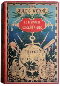 VERNE (Jules). Le Testament d’un Excentrique. 61 illustrations par Georges Roux. Paris, Hetzel, s. d. (1899). Grand in-8, cartonnage éditeur percaline rouge type au globe doré de type 3, dos au phare. Percaline un peu salie, mors déchiré...