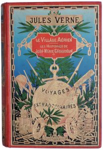 VERNE (Jules). Le Village Aérien. Les Histoires de Jean-Marie Cabidoulin. 38 dessins par Georges Roux. 6 grandes chromotypographies. Une carte. Paris, Hetzel, s. d. (1901-1902). In-8, cartonnage percaline rouge au globe doré de type 3, tranches...
