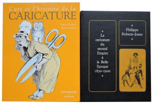 CARICATURE. Réunion de deux ouvrages : • ROBERTS-JONES (Philippe). La Caricature du Second Empire à la Belle Epoque. 1850-1900. Paris, Club Français du Livre, 1963. In-4, cartonnage éditeur. 451-(10) pp. Nombreuses reproductions en noir à...