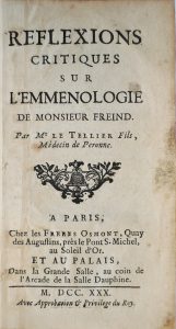 LE TELLIER (Charles-François). Reflexions Critiques sur l’Emmenologie de Monsieur Freind. [Suivi de] QUESNAY (François). Observations sur les Effets de la Saignée… Paris, Osmont, 1730. In-12, reliure basane marbrée, dos à 5 nerfs. Mors...