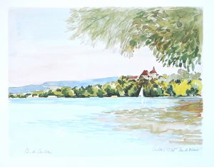 Dessins en noir dans le texte et 12 gouaches en couleurs (villages et paysages entre les lacs de Neuchâtel et de Bienne).