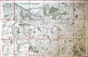 [ANJOU]. CASSINI. Carte d’Anjou. Richelieu - Saumur. N° 66 - Fle 75. Vers 1760. Grande carte (60 x 94,5 cm) en 18 feuilles (18,5 x 15,5 cm) entoilées, et soigneusement coloriée. Conservée dans son étui cartonné décoré (fond à...