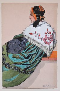 [BRETAGNE]. Costumes et Types Bretons. XXe s. et divers. • 12 aquarelles et gouaches (env. 24 x 16 cm) sur papier teinté, contrecollé sur papier fort, signées R. Robert, d’après les dessins de Géo-Fourrier, pseudonyme de Georges...