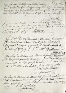 Livre de quittances faisant état des marchandises vendues et livrées à mademoiselle Masson à La Rochelle du 18 octobre 1786 au 11 mai 1789. 25 pp. manuscrites (et nbx ff. blancs), avec les reçus des divers fournisseurs et négociants (Schaaf, Delaire, Pinasseau, Bizeux, Langlais, Fouchereau, Brillanceau, Donneadieu…).