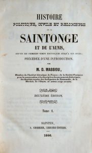 MASSIOU (Daniel). Histoire Politique, Civile et Religieuse de la Saintonge et de l’Aunis, depuis les premiers temps historiques juqu’à nos jours… 2e édition. Saintes, Charrier, 1846. 6 tomes en 3 volumes in-8, reliure demi-veau brun-noir,...