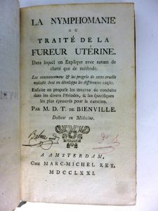 D. T. de) La nymphomanie ou traité de la fureur utérine. Dans lequel on explique avec autant de clarté que de méthode, les commencemens & les progrès de cette cruelle maladie dont on développe les différentes causes. Ensuite on propose les moyens de conduite dans les divers périodes, & les spécifiques les plus éprouvés. Pour la curation ... - Amsterdam Marc-Michel Rey, 1771 - in-12 : xx, 168 p.- basane ancienne, dos lisse orné.(sans coiffes, reliure usagée, rousseurs au dernier feuillet et sur les gardes)