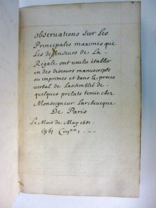 [REGALE] MANUSCRIT : Observations sur les principales maximes que les deffenseurs de la Régale ont voulu établir en des discours manuscripts ou imprimés et dans le procès verbal de l'assemblée de quelques prélats tenue chez Monseigneur...