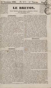 On joint dans une reliure identique (in-folio plus petit) : Le Breton. Sciences, agriculture, industrie commercre… Du 23 novembre 1826 (1er volume, n° 1) au 1er janvier 1828 (n° 172) [sauf n° 20, 81, 115 à 117, 136). Qq. traces d'usage mais importante tête de collection de ce journal parraissant 3 fois par semaine et imprimé à Nantes.