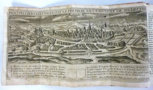 GARIEL (Pierre) Idée de la ville de Montpellier, recherchée et présentée aux honestes gens - Montpellier, Daniel Pech, 1665 - in-folio : [6] p., portrait replié, 1 vue cavalière Montpellier remontée (doublée), 264 p./ 156 p.