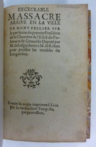 de Lesguidieres à M. de Rohan pour pacifier les troubles du Languedoc - Jouxte la copie à Laon par la veuve Jean Tempeste, s.d. [1622] - in-8 : 16 p. - Le Janus à deux faces envoyé à Montpellier - 1622 - 14 p. - L'heureuse journée de la S. Jean pour la desfaicte de trois cens soixante sept rebelles papillons sortis de Montpellier, & mis en pieces part partie de l'armée de Monseigneur le duc de Montmorancy. continuant le degast es environs de Lates mil six ces vingt-deux - Beziers, Jean Pech, 1622 - 8 p. - Les mémoires au vray, de tout ce qui s'est passé en l'armée royalle au siège de Montpellier jusques à présent avec la prise des dehors dudict Montpellier - Paris, Nicolas Rousset, 1622 -12 p. - Harangue faicte au roy par messieurs [Les trésoriers de France] de Montpellier - 1622 - in-12 : 14 p. - En 1 volume reliure postérieure bradel demi-vélin, p. de titre grenat. (court de marges)