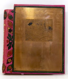 Le cuivre original, le croquis original signé à la mine de plomb et à l’encre et l’aquarelle originale signée ont été monté aux plats et contreplat de la reliure