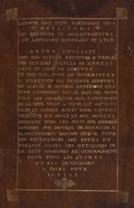 Important document, qui illustre bien le fonctionnement l'Aumône générale de Lyon au milieu du XVIIe siècle. Fondée après la grande disette de 1531, et démarrant son activité à partir de 1533, cette institution financera la construction de l'hôpital général de la Charité de Lyon (aujourd'hui disparu). C'est l'exemple d'une fondation destinée à soulager les pauvres, et qui permet à la ville de contrôler et de modérer les populations en difficulté. Ancêtre de l'Assistance publique, l'Aumône générale poursuivra son activité jusqu'en 1934