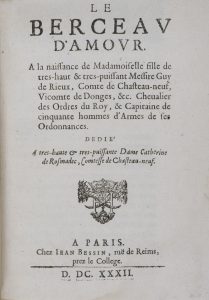 *** [MALINGEAYE (de)]. Le berceau d'amour, à la naissance de Mademoiselle fille de… Guy de Rieux, comte de Chasteau-neuf, Vicomte de Donges, &c… A Paris, chez Jean Bessin, 1632, in-4, [2] f., 10 p., vignette au titre, bandeaux et lettrines...