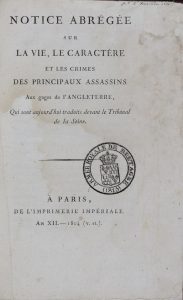 *** [MONTGAILLARD (Maurice de)]. Notice abrégée sur la vie, le caractère et les crimes des principaux assassins aux gages de l'Angleterre qui sont aujourd'hui traduits devant le Tribunal de la Seine… Paris, Impr. impériale, an XII (1804), in-8,...