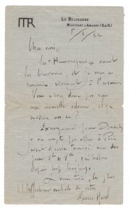 RAVEL (Maurice) (1875-1937). Lettre autographe signée à Tristan Klingsor, Montfort l’Amaury, 5 janvier 1922. 1 page in-8. En-tête gravé à son chiffre et à son adresse. Adresse. « Les « Humoresques » seront les bienvenues, et je vous en...