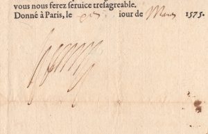 HENRI III (1551-1589). Lettre en partie imprimée signée « Henri », contresignée par Brulart, aux gens de Semur en Auxois, Paris 11 mars 1575, 2/3 page in-folio sur papier, adresse. Bord gauche abimé, trou enlevant 3 mots du texte. Henri III...
