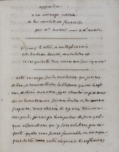 On joint : NECKER. De la Révolution française. Nouvelle éd. avec des additions de l'auteur. P., Impr. Drisonnier, an V (juin 1797), 4 vol. in-12 reliure début 19e s., demi-basane havane, dos lisses, pièces de titre saumon, papier des plats raciné (reliure qui a servi de modèle celle du manuscrit ci-dessus). Ex-libris manuscrit d'Alexandre de Palys, ex-libris ms. antérieur biffé au v° d'un titre et d'un faux-titre, ex-libris bibliothèque de Clays-Palys.