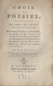 [CAZIN]. Choix de poésies traduites du grec, du latin, et de l'italien. Londres, [Cazin], 1786. 2 volumes in-12, brochés, non coupés, chemise, étui (Pierre Mercier - 1992).