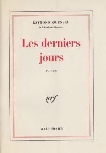 QUENEAU (Raymond). Les Derniers Jours. Paris, Gallimard, 1977. In-8, broché, chemise, étui. Boîte signée, non datée, (Pierre Mercier).