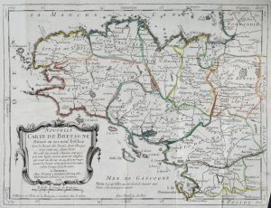 basane havane mouchetée, dos à 5 nerfs et ornés, pièces de titre et de tomaison maroquin grenat et havane, tr. rouges (accroc à 5 coiffes, mors fendu avec trav. de vers, au tome 1, qui a aussi 2 coins émoussés, mouill. en marge des f. limin. du t.1, réparation d'un pli de la carte et en marge du 1er f. trav. de vers en marge au t.5, ensemble convenable). Chaque partie possède une page de titre particulière : Histoire des ducs de Bretagne (t.1 & 2, par P.-Fr. Guyot Desfontaines) ; Histoire particulière de la ligue en Bretagne (t.3 & 4, par de Rosnivinen, marquis de Piré ; retouchée et rédigée par l'abbé Desfontaines, d'après Barbier) ; Dissertation historique sur l'origine des bretons (t.5 & 6, par Galet, d'après Barbier.)