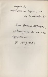 Édition originale. Exemplaire du service de presse, enrichi d'un envoi autographe de l'auteur et d'une photographie dédicacée. On joint 5 ouvrages de ou sur François Augieras : Le Vieillard et l'enfant. Éditions de Minuit, 1954. – Domme ou l'essai d'occupation. Fata Morgana, 1982. Un des cinquante exemplaires du tirage de tête sur Johannot. – La Chasse fantastique (en collaboration avec Paul Placet). Phalène, 1984. – Lettre du Mont Athos à Paul Placet. Brandes, 1987. Tirage à 350 exemplaires sur vergé. – Pour François Augieras. Bib. Municipale de Lyon, 1990.