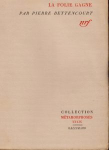 BETTENCOURT (Pierre). La Folie gagne. Paris, Gallimard, 1950. In-12, broché.