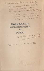 PRILLE (Pol). Bois de Boulogne, bois d'amour. Montaigne, 1925. Bois originaux de Sima. OULMONT (Charles). Paris, ce qu'on y voit ce qu'on y entend, illustrations de Bécan. Berger-Levrault, 1925. 1/85 pur fil Lafuma. ALMANACH DE SAINT-GERMAIN DES PRÉS. L'Ermite, 1950. 1/500 vélin (tirage de tête). SIEGFRIED (André). Géographie humoristique de Paris. La Passerelle, 1951. 1/270 pur fil Johannot, bel envoi autographe de l'auteur. LANOIZELÉE (Louis). Les Bouquinistes des quais de Paris, bois de Lebédeff. Chez l'auteur, 1956. Envoi a.s. SEIGNOLLE (Claude). La Nuit des Halles. Maisonneuve et Larose. 1965. 1/1000 alfa.
