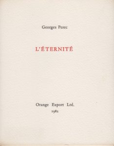 Quel petit vélo à guidon chromé au fond de la cour ? Denoël, 1966. In-8, broché. Un homme qui dort. Denoël, 1967. In-8, broché. Petit traité invitant à la découverte de l'art subtil du Go. Bourgois, 1969. In-12, broché. Les Mots croisés I. Mazarine, 1979. In-8, broché. La Disparition. Denoël, 1979. In-8, broché (Réédition). Récits d'Ellis Island (avec Robert Bober). Éditions du Sorbier, 1981. In-8, broché. Cocktail Queneau, in revue Faire-part, numéro 1, automne 1982. L'Éternité. Orange Export Ltd, 1982. In-12, broché. Second tirage à 100 exemplaires sur Arches. Les Mots croisés II. P.O.L. et Mazarine, 1986. In-8, broché. "53 jours". P.O.L., 1989. In-8, broché.