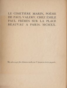 Édition originale. Un des 500 exemplaires sur papier du Mittineague-mill, seul tirage avec 49 Arches et 7 chine. On joint deux autres éditions : Le Cimetière marin. 1948. Exemplaire sans doute unique, calligraphié et réalisé le vingt septembre 1948. Tirage photographique (des crânes) contrecollé. Le Cimetière marin. Grenoble, Boissard, 1954. 2 volumes in-4, broché, en feuilles (pour les fac-similés). Un des 950 chiffon de Rives, seul tirage avec 26 hors-commerce. Jolie et savante réalisation : les fac-similés des manuscrits de Paul Valéry ont été réalisés par les ateliers Jacomet.