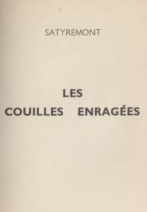 Édition originale publiée sous le pseudonyme de Satyremont, et illustrée de dessins libres non signés, mais qui sont d'Yves Tanguy. Un tirage important est annoncé, mais le livre ne circula jamais, une grande partie du tirage ayant été détruite. On peut noter que les pages de faux-titre et de titre dévoilent le sens du livre, écrit en 1928 : "Les couilles enragées".
