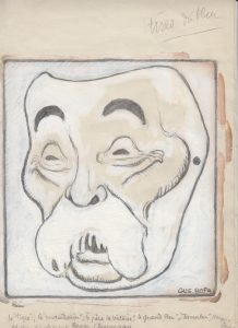 Dessin original sur vergé mince, au crayon et à la gouache, signé et légendé. Bofa représente le visage de Clémenceau sous forme d'un masque, justifiant son surnom de "masque de jade". Beau portrait.