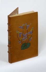 ADAM (Juliette). Grecque. Paris, Calmann Lévy, 1879. In-12, maroquin lavallière, décor mosaïqué de violettes polychromes sur les plats et le dos, filet et emblèmes napoléoniens dorés intérieurs, doublures et gardes de soie grège à motifs...
